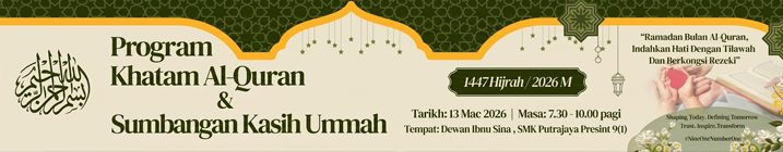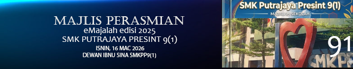 Majlis Pelancaran eMajalah Next9 Chronicle Edisi 2025 – Isnin, 16 mac 2026, 7.30 pagi , Dewan Ibnu Sina [ Foto ]Majlis Iftar Jamaie & Solat Terawih Berjemaah, Jumaat : 13 mac 2026, 5 petang hingga 10.00 malam Dataran Madani & Dewan Ibnu Sina SMKPP91 [ Foto ]Majlis Khatam Al-Quran & Sumbangan Asnaf Peringkat Sekolah, Jumaat : 13 mac 2026, 5petang hingga 7.30pagi – 10.00pagi, Dewan Ibnu Sina SMKPP91 [ Foto ]Ceramah Nuzul Alquran, Jumaat 6-mac-2026 Dewan Ibnu Sina SMKPP91 [ Foto ]PELANCARAN SAHABAT CARE & STUDENT’S VOICE Isnin | 2 Mac 2026 | 7.30 pagi, Dewan Ibnu Sina [ Foto ]Alhamdulillah, Tahniah Cg Nurul Intan & guru2 Kelab PNB 9One!.Semoga terus cemerlang untuk 2026MAJLIS SEUNTAI MEMORI, SEJAMBAK DOA Ustaz Amran bin Mat Arriffen Jumaat | 27 Februari 2026 | 9 Ramadhan 1447 Dewan Ibnu Sina, SMKPP 9(1) [ Foto ]PELANCARAN PROGRAM AMALAN SEKOLAH PENYAYANG & MINDA SIHAT 2026 Isnin | 23 Februari 2026 | 7.40 pagi [ Foto ]CERAMAH AMBANG RAMADHAN Ramadhan Dihayati, Sahsiah Disemai Oleh : Ustaz Mohd Aimanudiin bin Mohd Rozli Jumaat | 25 Syaaban 1447 | 13 Februari 2026 Dataran Madani SMKPP9(1) [ Foto ]TEMASYA SUKAN 2026 SMK PUTRAJAYA PRESINT 9(1). 12 Februari 2026, Padang Sekolah SMKPP9(1). Tahniah Rumah Syahbandar diatas kemenangan tempat pertama Sukan Tahunan Sekolah2026 [ Foto ]Syukur alhamdulillah..5 orang atlet 9(1) berjaya mendapat pingat dalam kejohanan merentas desa mss putrajaya 2026 pada 11 feb 2026. [ Foto ]Lawatan Delegasi Jepun Ke Smk Putrajaya Presint 91 – 29 jan 2026 [ Foto ]TahniahPuan Maizatul Arzia binti Omar A.M.W, Pengetua SMKPP9(1) dijemput sebagai Guest Speaker & menerima JTB’s Award 2025. [ Foto ]LARIAN JUARA 2026� Jumaat | 23 Januari 2026 | Taman Botani, Putrajaya [ Foto ]MAJLIS AKUJANJI & PENETAPAN TARGET SPM 2026 ~Khamis | 22 Januari 2026 | Dewan Ibnu Sina [ Foto ]MAJLIS PENYERAHAN SURAT PENURUNAN KUASA MELAKSANAKAN HUKUMAN & DEMONSTRASI ROTAN ~ Isnin | 19 Januari 2026 | Dewan Ibnu Sina [ Foto ]Tahniah 9one Pengurusan Kewangan Sekolah & Memperoleh Sijil Audit Tanpa Teguran. [ Foto ]Terima kasih kepada Jabatan Bomba & Penyelamat W.P Putrajaya di atas bantuan pemasangan bendera di SMKPP9(1).Terima kasih YDP PIBG 9One, En Uzair bin Mat Deris dan ajk-ajk PIBG di atas kesudian meluangkan masa untuk bersama pihak sekolah serta NGO (CSR) dalam penetapan lokasi CCTV bagi meningkatkan aspek keselamatan di sekolah. YDP PIBG serta ajk -ajk PIBG turut dibawa melawat sekitar bangunan serta kelas bagi tujuan perancangan baikpulih & naiktaraf pada masa akan datang Program Fun Learning, 14 Jan 2026 : Amali Sembelihan [ Foto ]Program Fun Learning, 14 Jan 2026 : 9One Got Talent [ Foto ]Program Fun Learning – 13 jan 2026 [ Foto ]Hari Pertama Persekolahan Sesi 2026 – Sini . 12 Januari 2026 [ Foto ]Selamat datang kepada guru-guru yang baharu berpindah masuk ke SMK Putrajaya Presint 9(1). Selamat Datang ke SMK Putrajaya Presint 9(1)Hari Pendaftaran Tingkatan1 Sesi 2026 Rabu | 7 Januari 2026 | 8.30pg [ Foto ]MAJLIS PERPISAHAN GURU & AKP Jumaat | 19 Disember 2025 | Dataran Madani SMKPP9(1) [ Foto ]MAJLIS APRESIASI & ASPIRASI MURID (MADAM) 2025, Jumaat | 12 Disember 2025 | 9.00 pg – 12.00 tgh Dataran Madani SMKPP9(1), Dirasmikan oleh : ENCIK MOHAMAD UZAIR BIN MAT DERIS YDP PIBG SMKPP 9(1) [ Foto ]HARI BICARA AKADEMIK Ujian Akhir Sesi Akademik 2025 & Taklimat Pakej Akademik Tingkatan 4 Sesi 2026 Jumaat | 5 Disember 2025 | 8.30pg – 12.30tgh Dataran Madani SMKPP9(1) [ Foto ]PROGRAM SIMULASI HAJI TINGKATAN 4 Anjuran : Panitia Pen. Islam dengan kerjasama Badan Dakwah dan Kerohanian, Jumaat 28 nov 2025 [ Foto ]Tahniahhhhh Naib Juara Kuiz PNB Kebangsaan. Terima Kasih Cikgu Intan dan guru-guru Kelab PNB atas bimbingan dan kerjasama yang mantap [ Foto ]Majlis Restu Ilu Calon SPM 2025,Jumaat, 21 nov 2025, 8.00 – 9.00 pagi, Dataran Madani SMKPP91 [ Foto ]Sepak Takraw bwh 14 tahun Luar Musim MSSWPP 2025 Tahniah pasukan Sepak Takraw 9one tempatKE-3 Tahniah kpd pasukan sepak takraw & guru² yg terlibat.*GEMA IQRA’ 3.0: KEMBARA ILMU MUZIKAL* Bersama: Ustaz Adnin Roslan (Tarbiah Sentap) Jumaat | 14 Nov 2025 [ Foto ]‘MEET & GREET’ Puan Pengetua 9one yg bharu iaitu Pn. Maizatul Arzia Omar A.M.W bersama guru² SMKPP9(1) JUMAAT, 14 NOVEMBER 2025, 7.30 – 8.00 PG, BILIK MESYUARAT SMKPP91 ‘Trust.Inspire.Transform’#NineOneNumberOne [ Foto ]Tahniah di atas beberapa kemenangan dalam Kejohanan Olahraga Luar Musim 2025 – Perak L14 4x100m , Gangsa L14 100m, Perak P14 Lontar Peluru, Perak L16 Lontar Peluru [ Foto ]Alhamdulillah🤲..Pasukan 9one mendapat naib johan🥈 Robomaster Robotic MBM cup 2025🤖 dan berjaya membawa balik medal, sijil , 2 set robot serta wang wang tunai RM300. [ Foto ]Sanjungan Jasa, Budi Disemai Bakti Dituai Majlis Perpisahan : Ustaz Ai’iri bin Abu Bakar Mantan Pengetua SMKPP9(1), Jumaat 7/11/2025 . Terima kasih Tuan & Selamat Maju Jaya [ Foto ]Selamat bertugas di sekolah baharu Ustaz Ai’ri bin Abu Bakar Selamat datang diucapkan kepada Puan Marzatul Arzia binti Omar A.M.W sebagai Pengetua Baharu SMKPP9(1) [ Foto ]MAJLIS SOLAT HAJAT &MUNAJAT SPM 2025, JUMAAT, 31 OKT 2025, DEWAN IBNU SINA 6PTG-10MLM [ Foto ]MAJLIS PENYAMPAIAN SIJIL TUSYEN MUTIARA BESTARI Khamis | 29 Oktober 2025 | Bilik Mesyuarat SMKPP9(1) Hadir Bersama :Datin Zuraiadah binti Hj. Endot (Presiden Badan Kebajikan Mutiara) [ Foto ]MAJLIS RESTU ILMU SPM 2025 SEKOLAH-SEKOLAH PUTRAJAYA Selasa | 28 Oktober 2025 | 8.30 pg – 10.00 pg | Dataran Madani SMKPP9(1) [ Foto ]